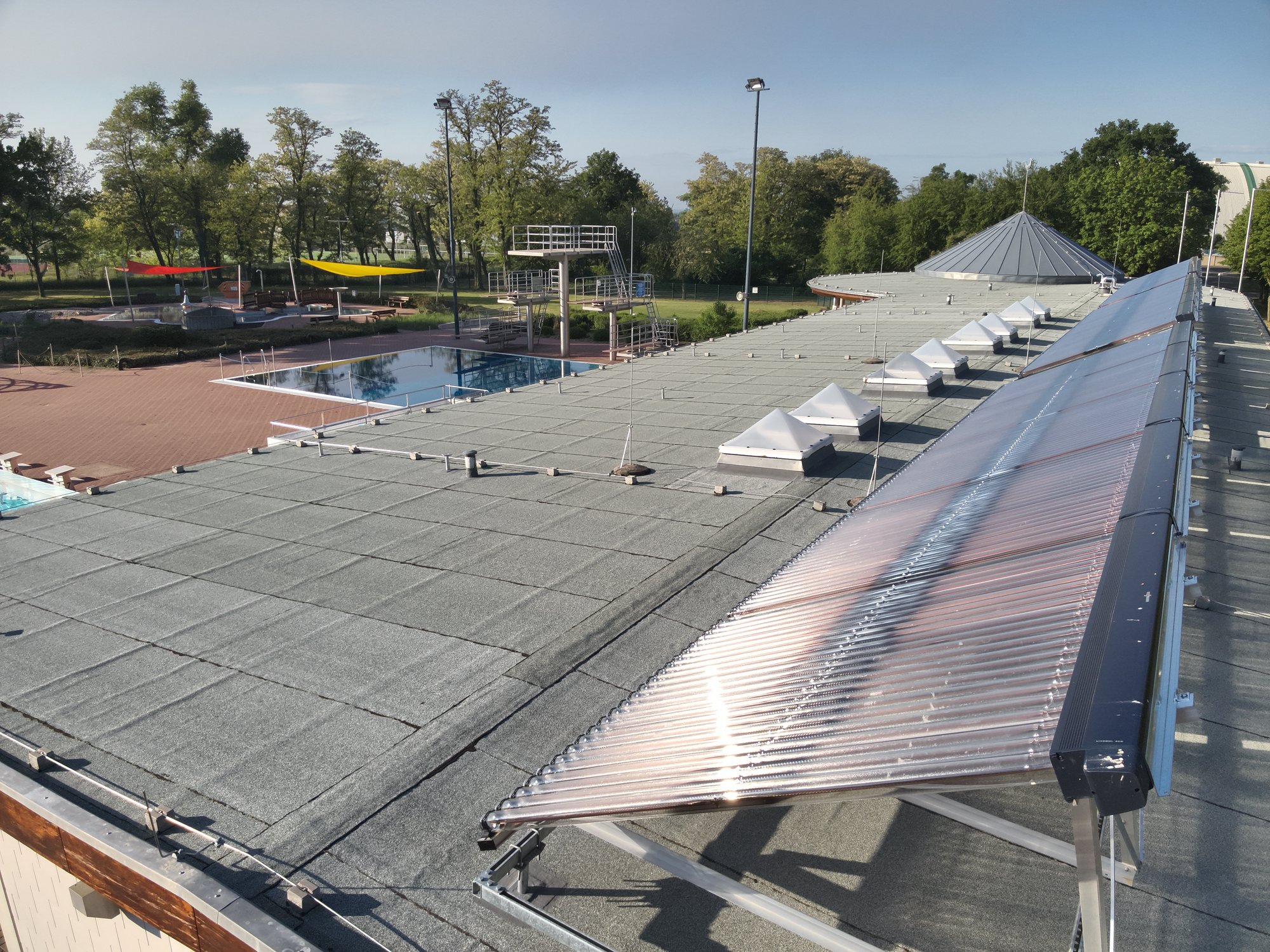 Kurz vor dem Start der Saison wurde auch eine moderne Solarthermie-Anlage in Betrieb genommen. Auf rund 48 Quadratmetern Kollektorfläche wird Sonnenenergie eingefangen und in Wärme umgewandelt. „Ob vor dem Sprung ins Wasser oder danach: wer im Freibad duscht, tut das künftig mit warmem Wasser, erhitzt durch die Solarthermie-Anlage, die den bisher genutzten Gasheizkessel vollständig ersetzt“, erklärt Horn. Sollte überschüssige Energie anfallen, kann diese in die Beckenheizung eingespeist werden.